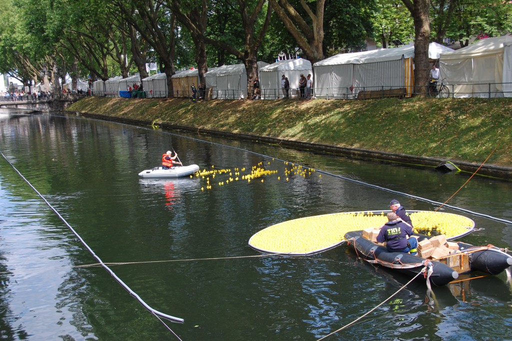 Unterstützt wurde das Unternehmen vom THW Düsseldorf. Der Start verzögerte sich etwas, da einige Enten ein Frühstart begangen haben. Diese mussten erst wieder eingefangen werden. Um den Enten etwas Speed auf den Weg zu geben wurde nach dem Start der Enten aus zwei C‑Rohren ca 8.000 ltr Wasser in die Rennstrecke gespritzt, um die Strömung etwas zu erhöhen.