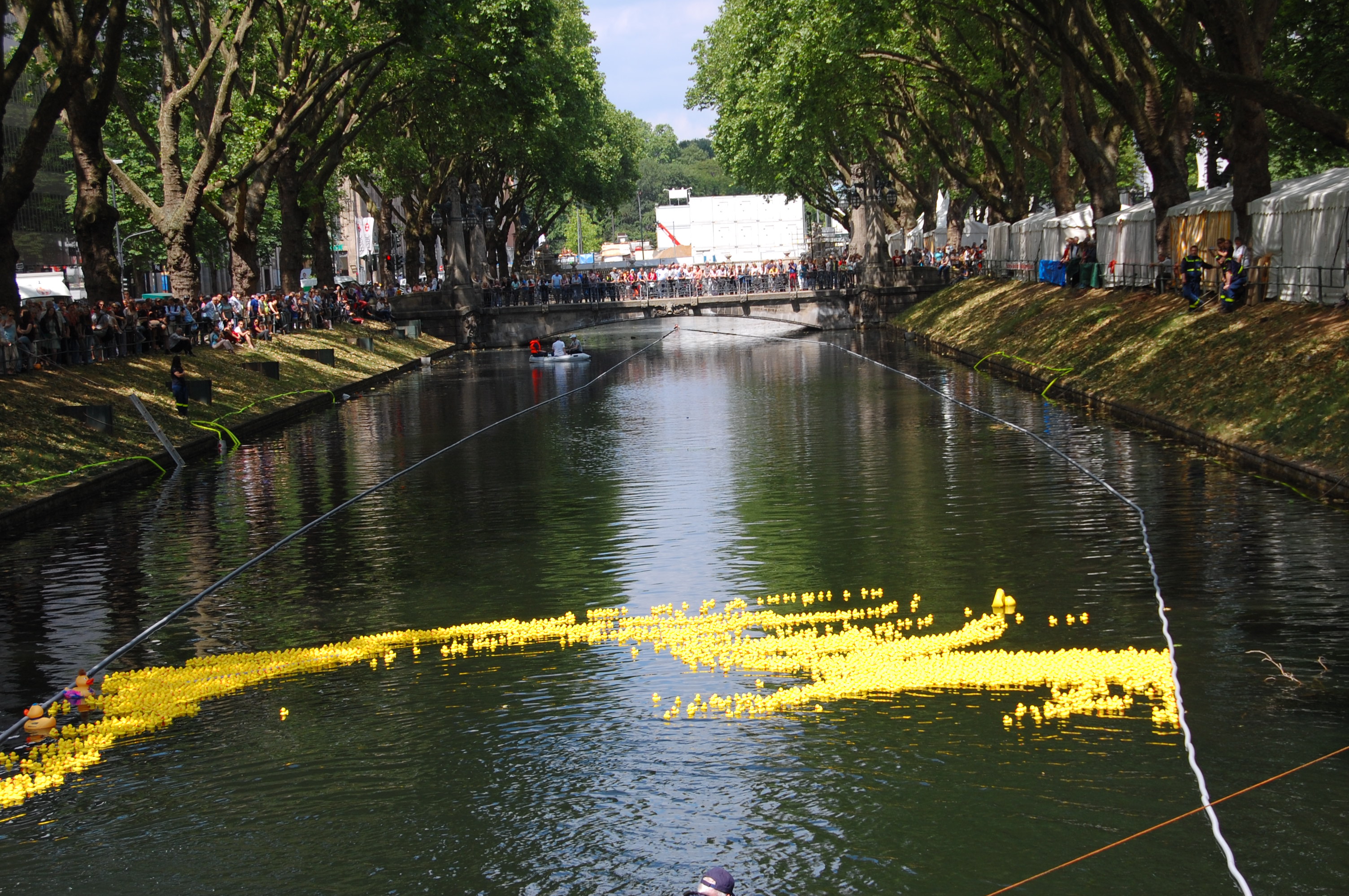 Heute veranstaltete der Lions Club Düsseldorf zum ersten Male das auch aus anderen Städten bekannte Entenrennen. Eigentlich sollte die Premiere im letzten Jahr erfolgen, wurde aber wegen Sturm “Ela“e abgesagt.