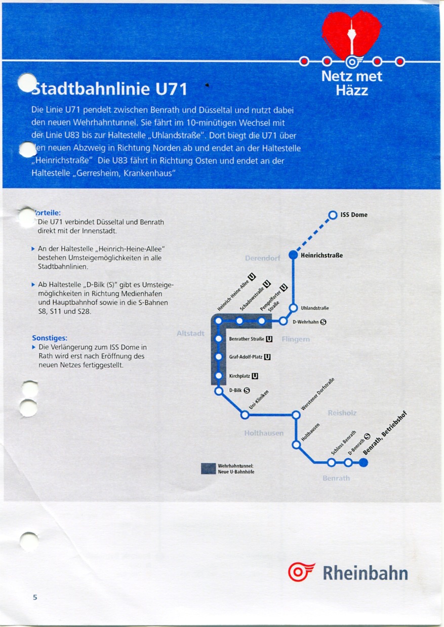 Heute veröffentlichen wir schon mal den Plan der Linie U71, die nach der Eröffnung des Wehrhahn-Tunnels zwischen ISS Dome und dem Betriebshof in Benrath pendeln wird.