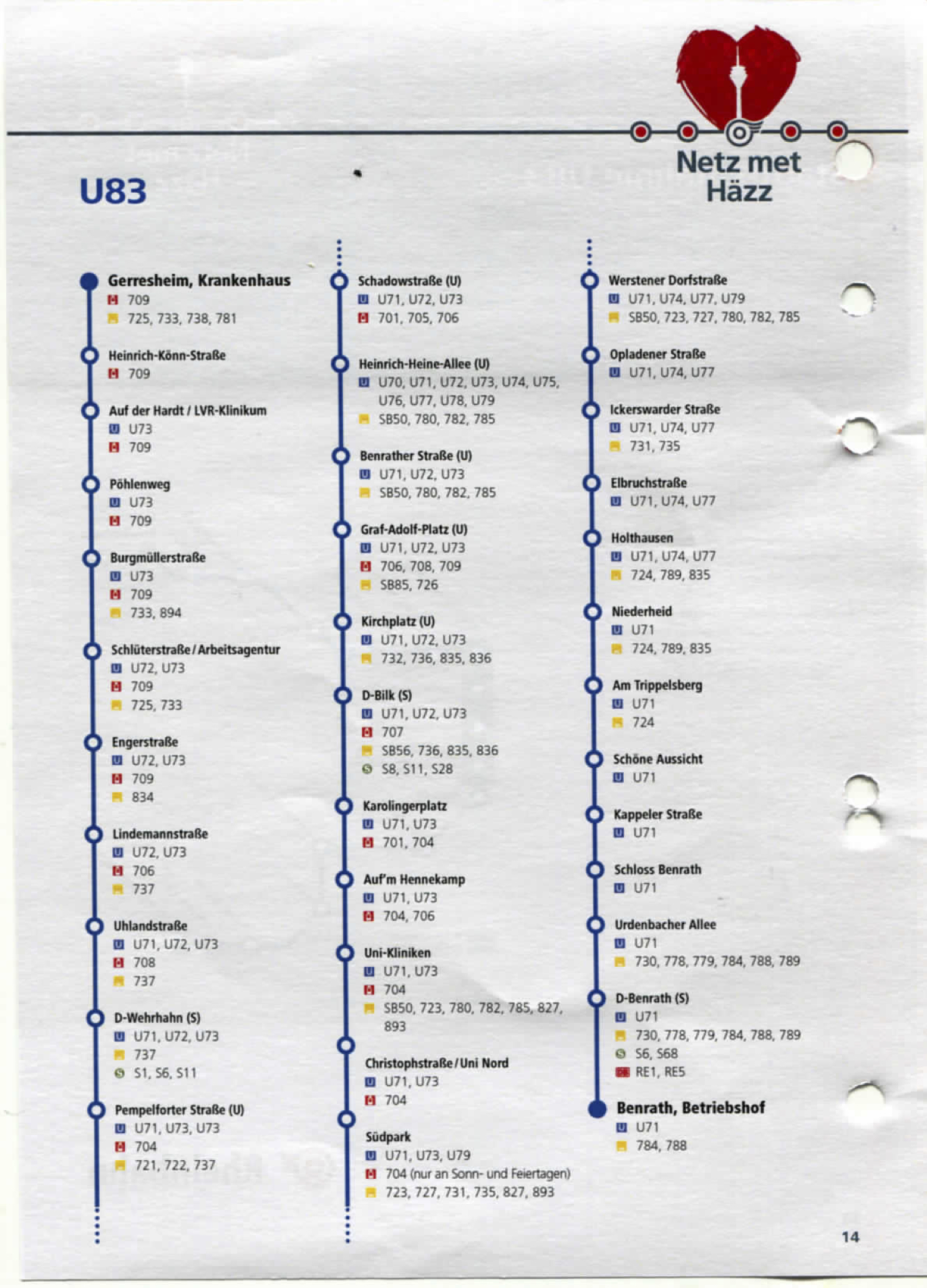 Die neue Linie verbindet Benrath mit der City, wechselt sich im Zehn-Minuten-Takt mit der U71 ab. Beide fahren bis Uhlandstraße. Dort allerdings biegt die U71 nach Norden zur Heinrichstraße, später dann zum ISS Dome ab.