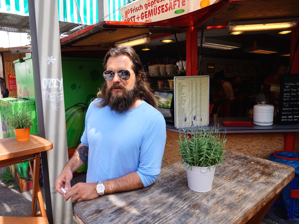 Prominenter Besuch, heute om Carlsplatz: Rennboot-Pilot Roger Klüh, vor zwei Tagen aus Kuba heimgekehrt, schlenderte Mittwoch über den Wochenmarkt. Und blieb — logisch — auf ein Schwätzchen beim Pfannenmann hängen.