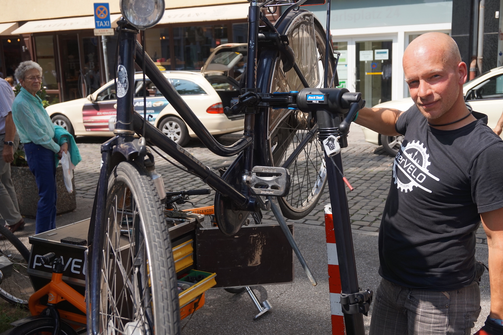 Andi: „ Die meisten Einsätze habe ich wegen platten Reifen. Wer — wie Sabine — morgens zur Arbeit radelt, sich unterwegs einen Reifen kaputt fährt, kann dann am Abend wieder mit den Rad nach Hause fahren. Ich erspare meinen Kunden das lästige Transportieren zur nächsten Werkstatt, die Warterei auf Termine.“ Die Preise: Normal. Reifen flicken mit Anfahrt für 25 Euro.