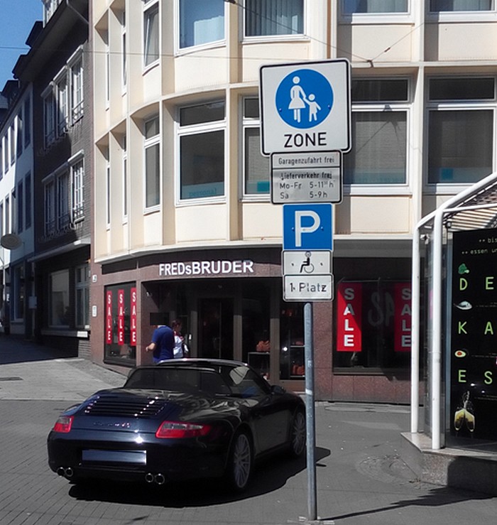 Direkt neben unserem Pummel fährt souverän ‑offensichtlich quasi mit Gewohnheitsrecht- ein Porsche auf den Gehweg neben dem Carschhausaufgang auf der Kasernenstraße und parkt dort routiniert sein Luxusgefährt.