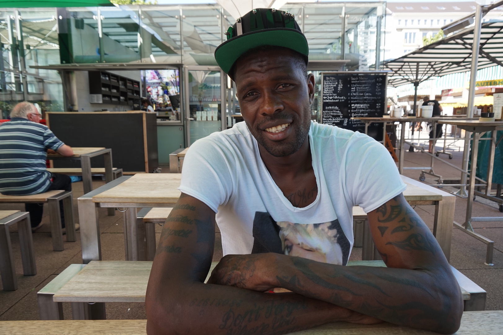 Mohamadou Idrissou ist kein Unbekannter. Früher bei er bei Gladbach und Freiburg gespielt. Was macht der Ex-Bundesliga-Profi in Düsseldorf? Mohamadou: “Ich kenne hier so viele Leute! Ich liebe diese Stadt, Düsseldorf ist meine 2. Heimat.”