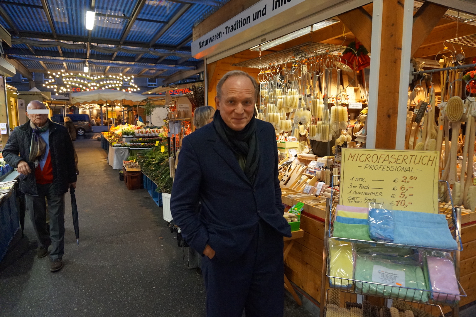 Der Schau­spie­ler, der durch viele Tat­ort­kri­mis  bekannt ist, schlen­derte völ­lig ent­spannt über den Carls­platz und staunte über das große Warenangebot.