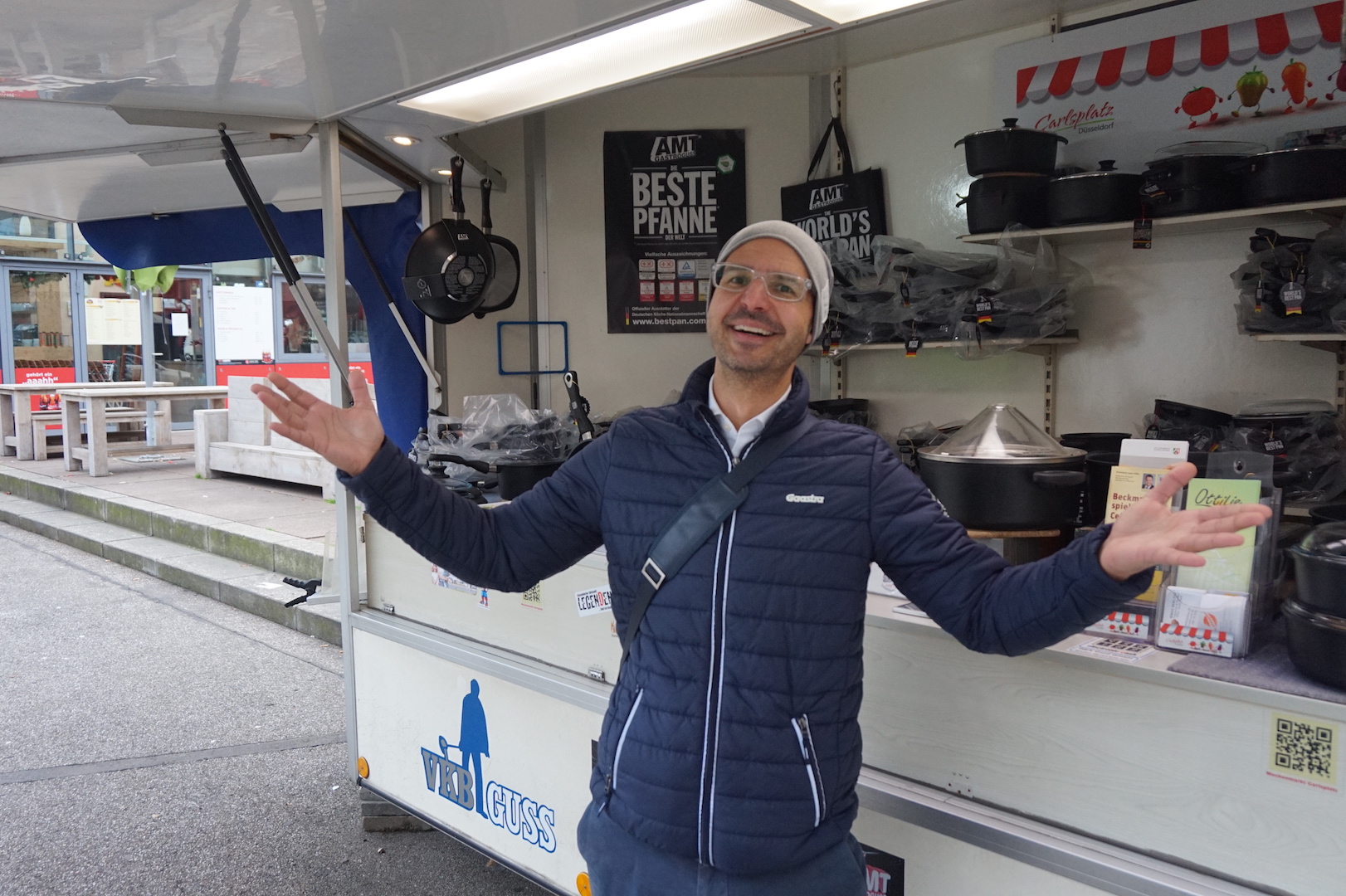 Rettet den Pfannenmann — mit einer Unterschriften-Aktion sucht Markthändler Wolfgang Harste die Unterstützung der Düsseldorfer. Nur ob’s was hilft…?