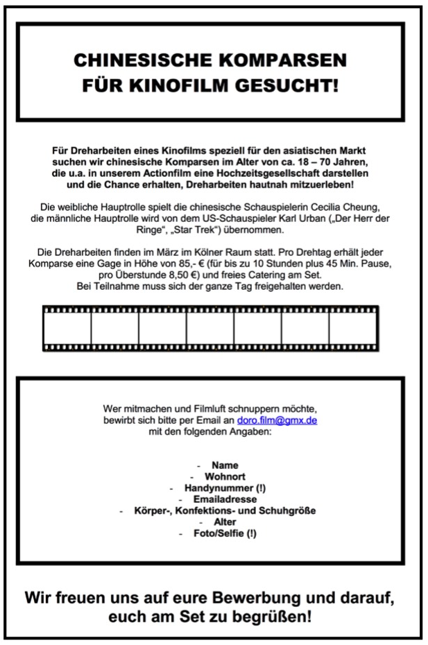 Für einen Kinofilmdreh mit Cecilia Cheung ( ) im März im Kölner Raum werden chinesische Komparsen gesucht. Da winkt nicht nur Spaß und Spannung, jeder Komparse verdient obendrein 85 Euro pro Tag. Das Düsseldorfer Konfuzius-Institut hilft suchen.