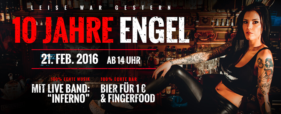 Zehn Jahre gibt es den „Engel“ jetzt in der Altstadt, dass schaffen nicht viele Kneipen. Und das soll jetzt gefeiert werden. Für Sonntag, den 21. Februar läd der „Engel“ zum rockigsten Geburtstag der Stadt! Gefeiert werden zehn Jahre Rockkultur, geboten werden Live Musik von „Inferno“, Bier für einen Euro.