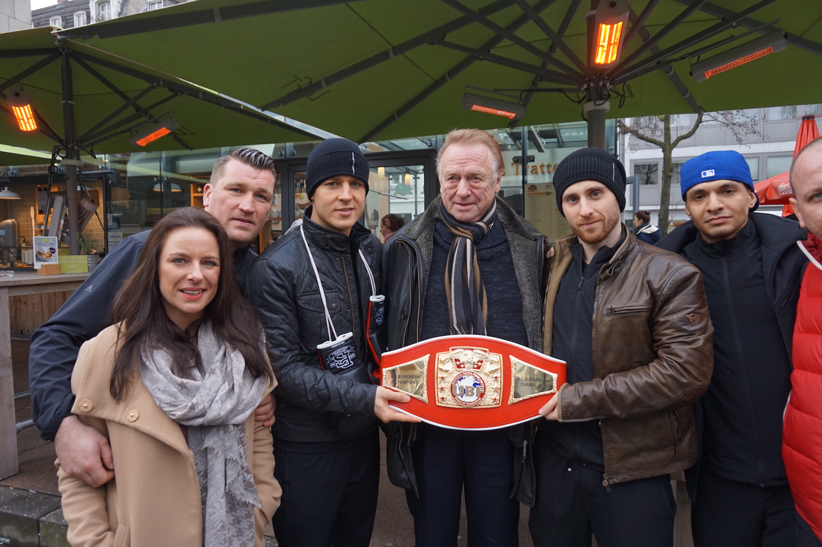 Alem Begic kam auf einen kurzen Termin auf dem Markt vorbei. Neben Mitglieder aus seinem Team war auch der Box-Papst Wilfried Weiser (70) in seiner Begleitung. Wilfried Weiser war Schwergewichtmeister und betreibt in Düsseldorf das legendäre Sport — Cafe „Beim Box — Papst“ in Oberbilk in der Vulkanstraße. Wilfried Weiser gibt letzte Tipps: “Afrikanische Boxer sind zäh. Denen wurde Ausdauer in die Wiege gelegt.”
