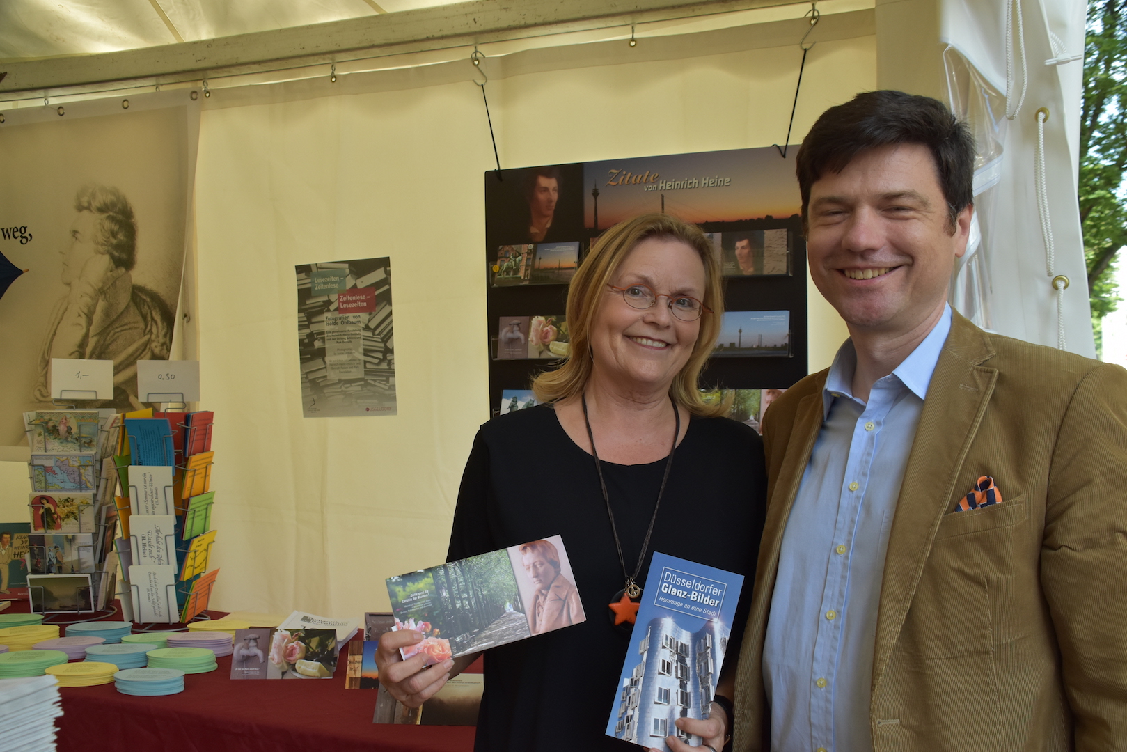 Wir besuch­ten heute zur Eröff­nung  Bab­ara Schmitz am Stand des Hein­rich-Heine-Insti­tut. Sie zeigt dort Post­kar­ten mit Moti­ven von Düs­sel­dorf, die mit Sprü­chen von Hein­rich Heine ver­se­hen sind.