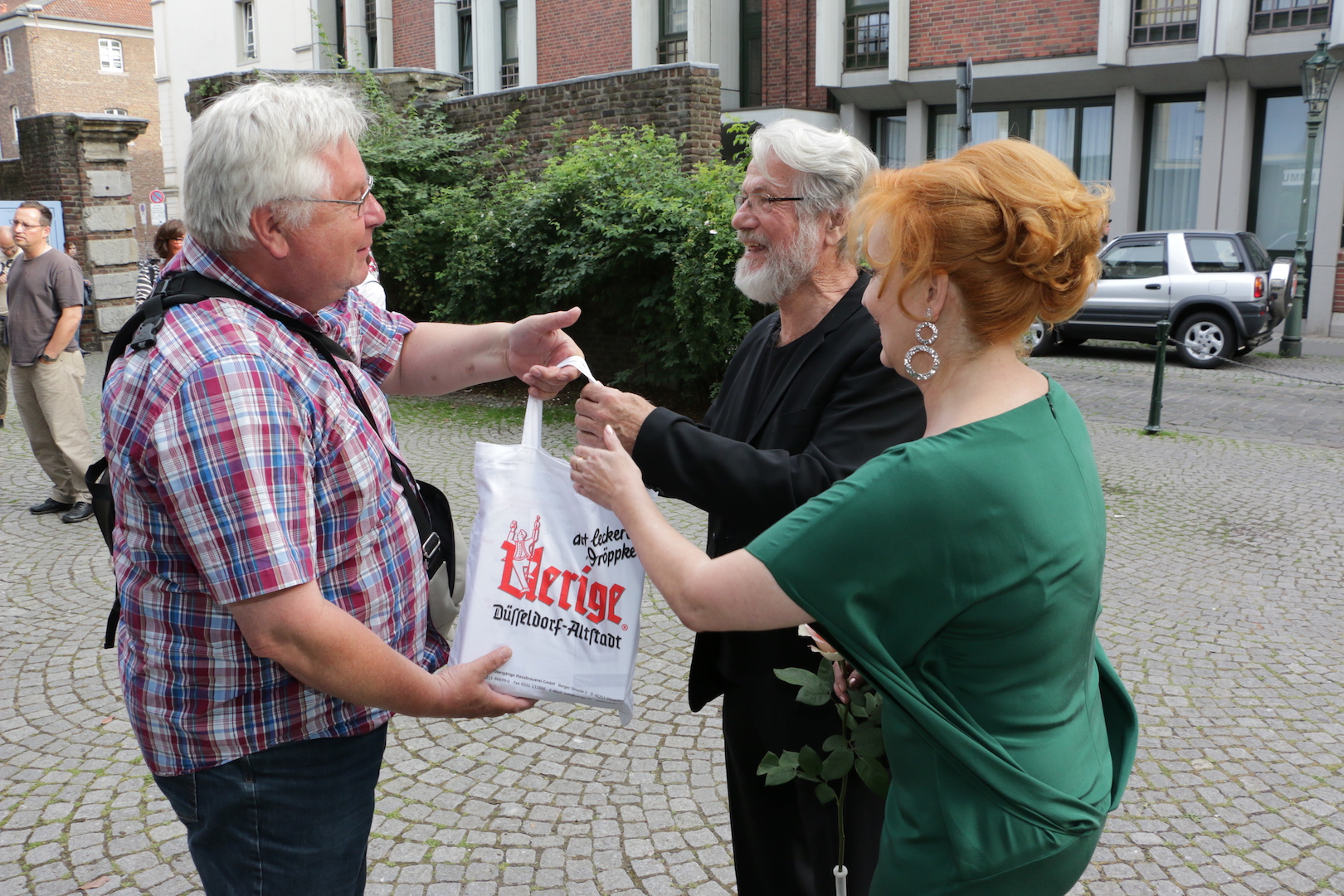 Lokal­büro Düs­sel­dorf hatte die erfreu­li­che Auf­gabe Jür­gen Proch­now Glück­wün­sche des Uerige zu über­brin­gen. Jür­gen Proch­now hatte bei der let­zen Pres­se­kon­fe­renz vor 4 Wochen gesagt, daß er sich gut vor­stel­len könnte mit einem Glas Uerige anzu­sto­ßen. Das ließ sich der Uerige nicht zwei­mal sagen und über­mit­telte durch das Lokal­büro ein pas­sen­des Geschenk.
