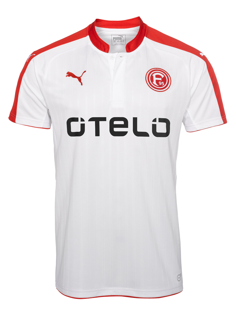 Das neue Heimtrikot setzt auf die Vereinsfarben rot und weiß, mit denen sich F95 seit Vereinsgründung an der Stadtflagge Düsseldorfs orientiert. Ein roter Formstreifen auf den Ärmeln, dezente Nadelstreifen und eine Knopfleiste am Kragen vollenden den klassisch-eleganten Look. Auf der Vorderseite sind das gestickte Vereinsemblem, das PUMA Cat Logo und der Trikotsponsor otelo präsent. Veredelt wird das Trikot durch eine gestickte „F95“ Aufschrift im Nackenbereich. Das Trikotdesign ist durch den Ausstatter PUMA eigens für Fortuna Düsseldorf gestaltetet.