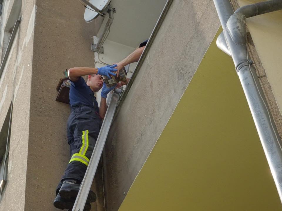 Bröckling: “Rettung war also nur von außen möglich. Unsere Leiter war zu kurz, jetzt konnte nur noch die Feuerwehr helfen. Das tat sie auch, ohne zu zögern. Die Retter sicherten alle sieben geschlüpften Winzlinge, holten sie vom Balkon.“