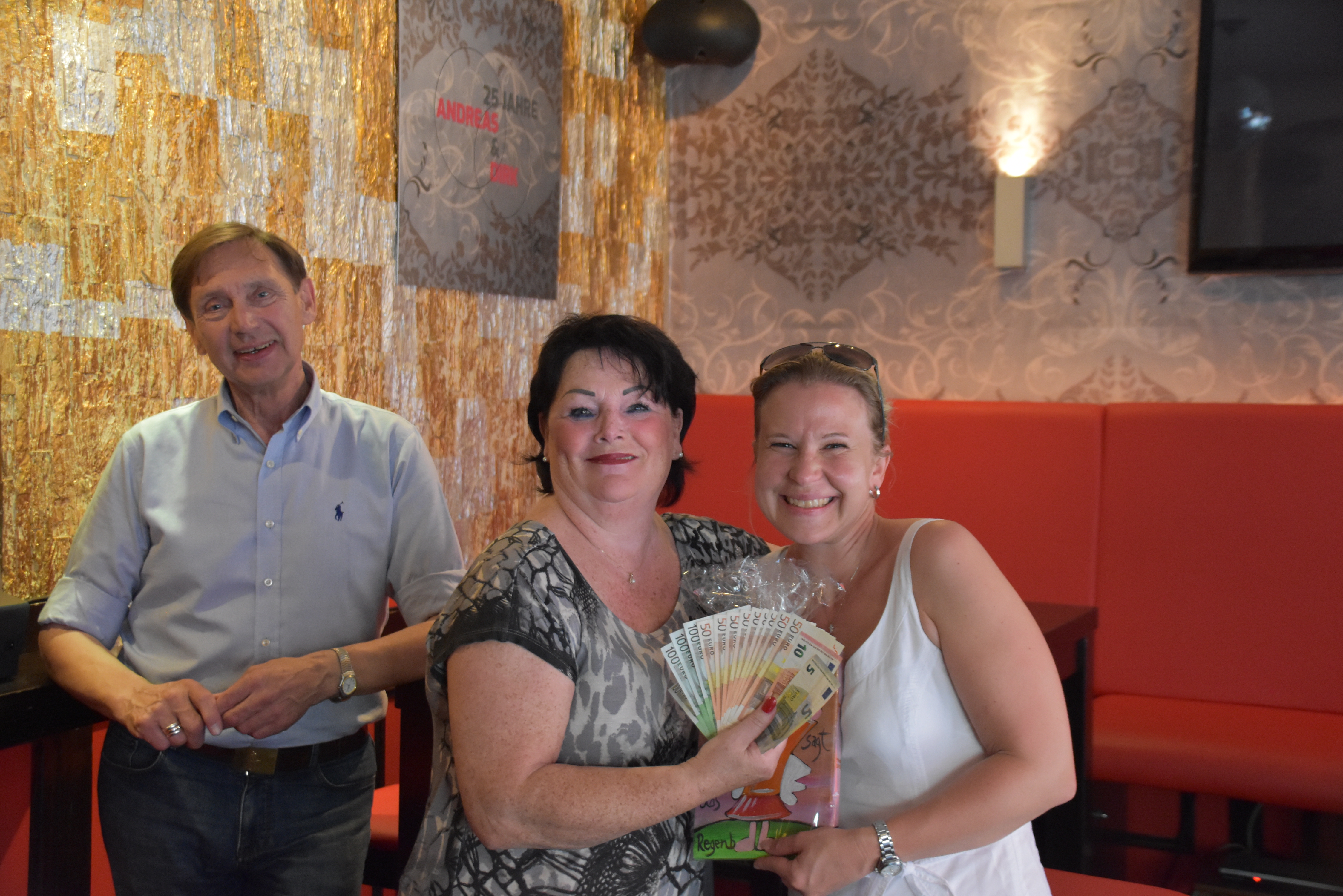 Karin Hock die Wirtin und Werner Kolkmann Mitorganisator freuten sich, daß eine solche schöne Summe zusammengekommen ist, die sie Frau Melanie van Dijk der Geschäftsführerin vom Regenbogenland übergeben konnten. Als Dank gab es den Schutzengel vom Regenbogenland, der einen Platz im Nähkörbchen finden wird.