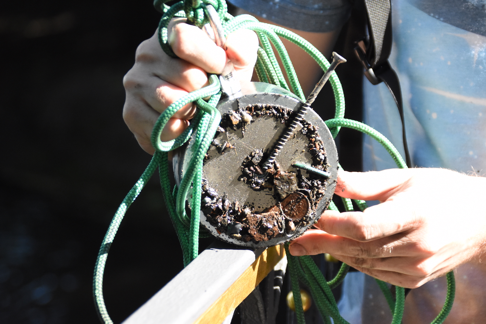 Angefangen haben sie mit einem kleinen Magneten. Mittlerweile benutzen sie ein Teil, das bis 800 kg heben kann. Und was angelt man? Heute haben sie schon ein 1‑Pfennig Stück, zwei fünf cent Stücke, einen Fahrradschlüssel und einen Nagel “gefangen”.