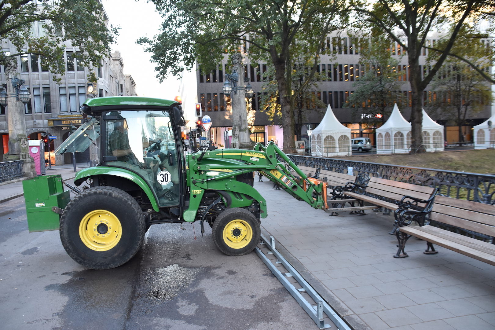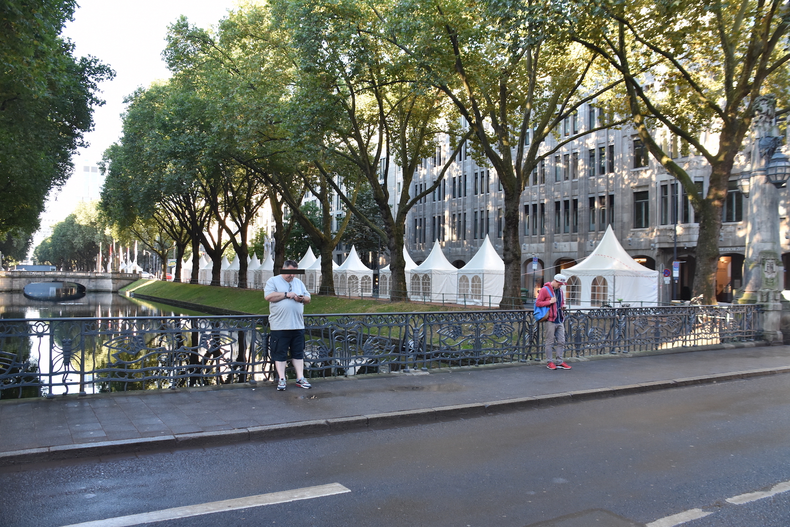 Anschließen rückten Mitarbeiter des Gartenamtes an, bugsierten die vielen Bänke von der Brücke zurück auf die Kö. Die Dixi-Klos wurden geleert und fortgeschafft. Zum Schluss verpasste die Awista der Brücke noch eine Feinreinigung.