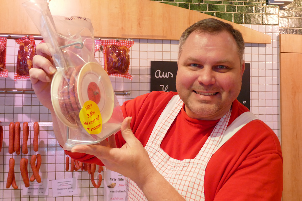 Dat iss et und Meister Willems hät et: 3,50 Meter lecker Mettwurst, transportfähig und feierfertig aufgerollt auf – ‘ne Kabeltrommel. Da kann Karneval kommen. Ob Sitzung, Party oder Open-Air am Zoch – mit diesem Werkzeug sind sie überall bestens gerüstet! Immer von der Rolle. Quasi. Also wenn’s ums futtern geht.