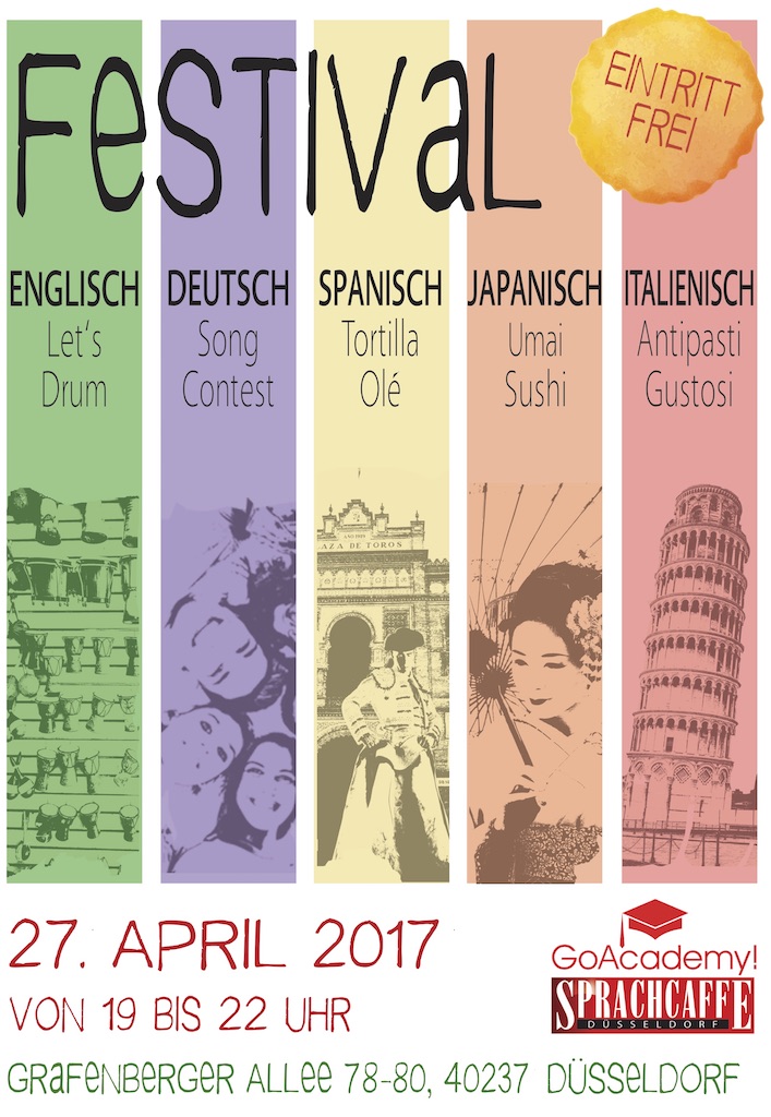 Fei­ern, lachen, neue Leute tref­fen — für Don­ners­tag, den 27. April 2017 lädt die Sprach­schule „GoAcademy!Sprachcaffe“ alle Sprach- und Kul­tur­in­ter­es­sier­ten wie­der herz­lich zum „Fes­ti­val“ ein!
