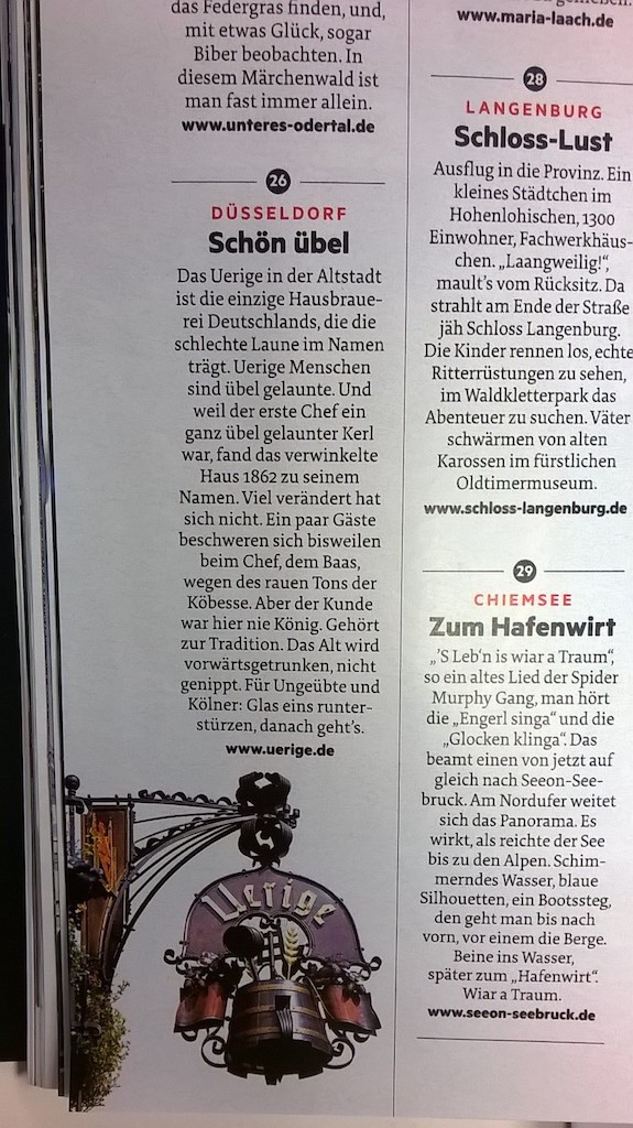 In der neuen Stern­aus­gabe ist ein gro­ßer Bericht über die 50 schöns­ten Orte. Orte, die ein Besuch wert sind. Auf Platz 26  lan­dete das Uerige aus Düs­sel­dorf. Wie fin­den zurecht, wobei Lokal­büro meint, Platz 1 wäre ange­mes­sen gewesen.