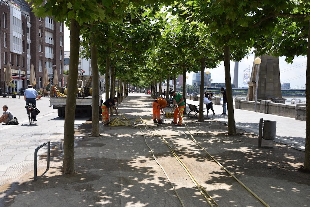 Die Platanen am Rheinufer bekamen heute eine Erfrischung. Das Gartenamt war mit mehreren Mitarbeitern und Wasserschläuchen unterwegs, um den Platanen am Rheinufer Wasser zu geben. Die Bäume brauchen im Schnitt 200 Liter Wasser am Tag. Da die Erde aber zu tief ausgetrocknet ist können die Bäume nicht mehr genug Wasser aus der Erde ziehen. Deswegen gab es jetzt eine Dusche. Wie die Mitarbeiter des Gartenamtes mitteilten ist dies am Rheinufer eigentlich nur ein bis zweimal im Jahr nötig.