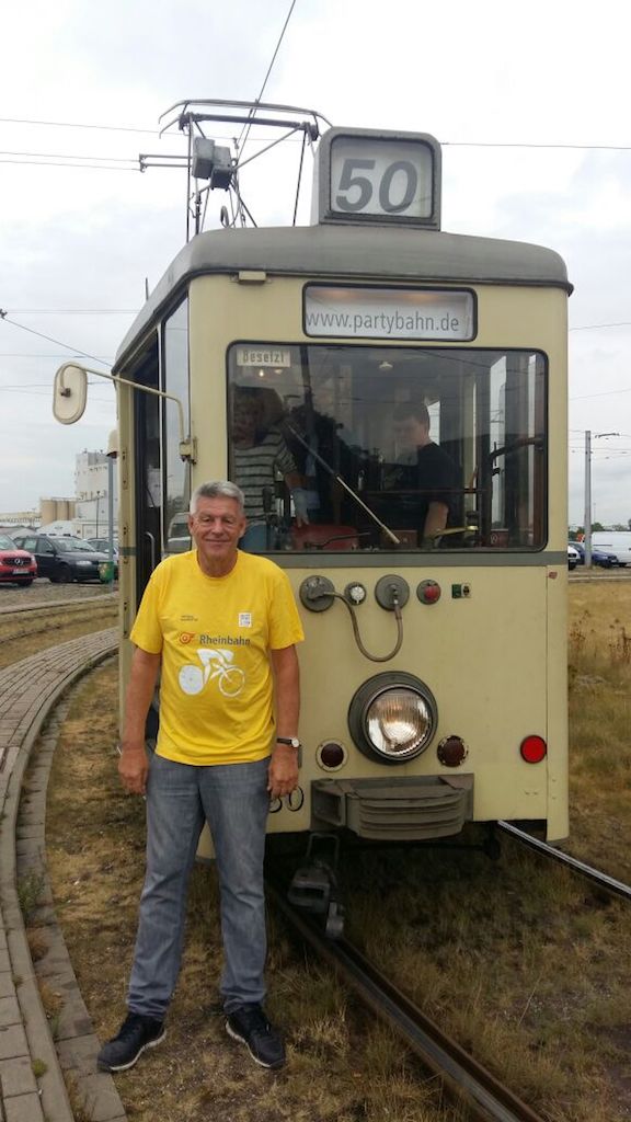 Doch zur Tour macht sich die Oldie-Bahn mit ihrem Fahrer Jürgen nochmal auf die Socken, karrt Touristen und Radfans durch die Stadt. Sie trägt beige, Fahrer Jürgen natürlich das Gelbe Trikot des Spitzenreiters. Zwei Sieger der Herzen, halt…