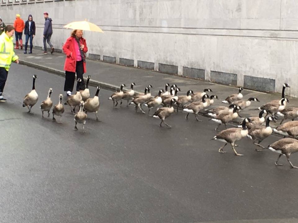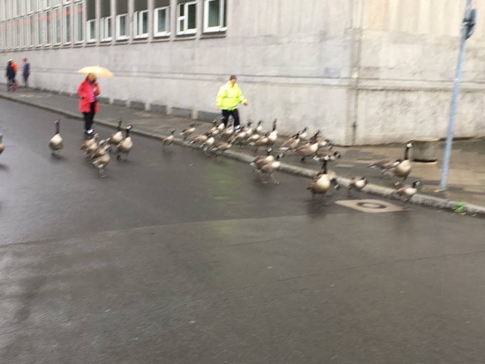 Die Gänse würden gerne in ihr Nachtlager am Schwanenspiegel, kommen aber wegen der Tour nicht über die Straße. An die Gänse hat aber auch keiner gedacht.
