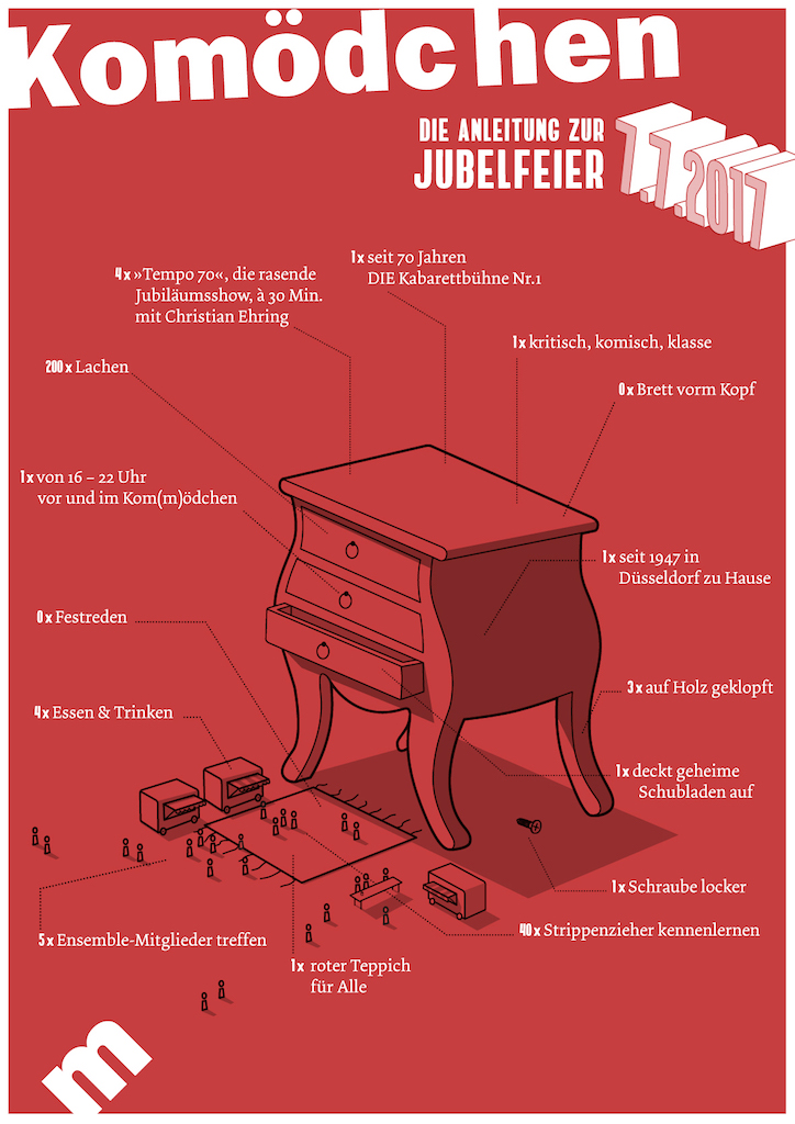Bahn frei, alle Rad­ler weg, jetzt gibt’s kein Hal­ten mehr!  Am 7.7.17 star­tet das Kom(m)ödchen durch und fei­ert sein 70-jäh­ri­ges Jubi­läum ab 16.00 Uhr am Kay-und-Lore-Lorentz-Platz. Jeder ist herz­lich ein­ge­la­den mit­zu­fei­ern und jeder darf auf den roten Tep­pich! Vor dem Haus wird es Spei­sen und Getränke geben, und das gesamte Team inklu­sive vie­ler Strip­pen­zie­her, nor­ma­ler­weise im Hin­ter­grund, nimmt Ova­tio­nen und Lob­hu­de­leien dan­kend ent­ge­gen. Wir ver­zich­ten auf alle Fest­re­den und Ehren­gäste. Mit dem Erschei­nen von Kabarett‑, Comedy‑, Polit- und ABC Society-Pro­mi­nenz muss den­noch gerech­net wer­den. Dabei sein ist alles! Kom­men Sie voll­zäh­lig, wir freuen uns.