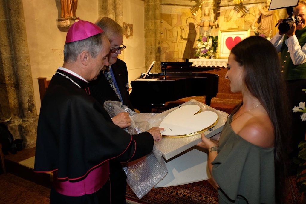 Ein Herz wurde jetzt jedoch an den Salzburger Weihbischof Dr. Hansjörg Hofer als Dank für Heribert Klein’s in Filzmoos entstandene Idee „ EIN HERZ FÜR UNICEF“ überreicht. Dr. Hofer versprach, dass das von Papst Franziskus signierte UNICEF-HERZ einen Ehrenplatz in der Dorfkirche erhalten wird. In der Wallfahrtskirche in Filzmoos findet seit 26 Jahren ein jährliches Unicef Konzert mit Künstlern aus aller Welt statt. Papst Franziskus hat dieses Herz speziell für den deutschsprachigen Raum mit FRANZISKUS unterzeichnet und nicht wie sonst üblich mit Francesco; worauf er ausdrücklich hinweisen lies — mehr als eine nette Geste. Vergoldet wurde das schlicht in weiß gehaltene Unicef-Herz von der Vergoldungs-Spezialistin Fabiana Capotti-Serrano, Vergolderin bei der Fa. Conzen in Düsseldorf.