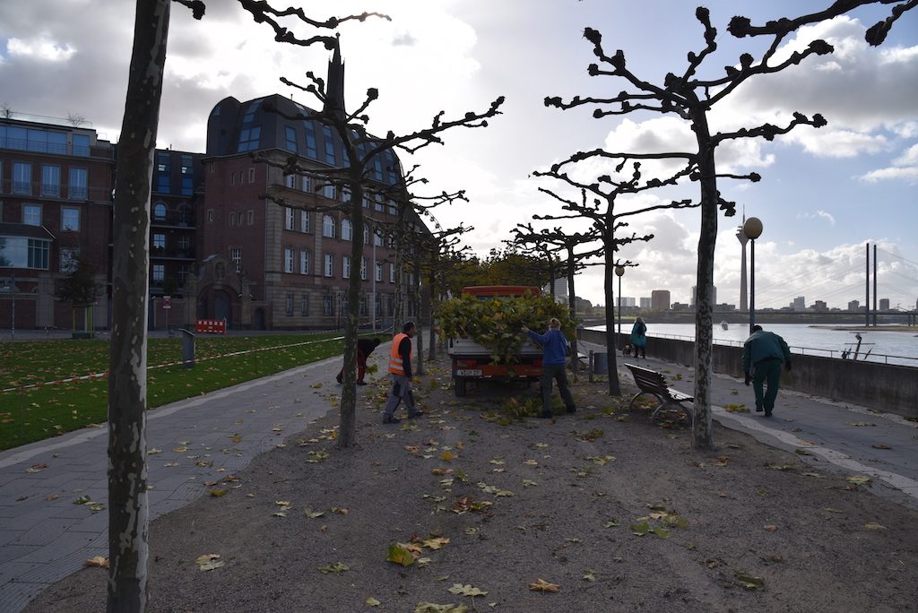 Die Mit­ar­bei­ter des  Gar­ten­am­tes der Stadt Düs­sel­dorf sind zur Zeit damit beschäf­tigt die Pla­ta­nen zurück­zu­schnei­den. Wie hier am Rhein ist es not­wen­dig den Bäu­men im Herbst einen Kahl­schlag zu ver­pas­sen, damit diese im Früh­jahr wie­der kraft­voll sprie­ßen kön­nen. Die Arbei­ten für das Gebiet Düs­sel­dorf dau­ern meh­rere Tage.