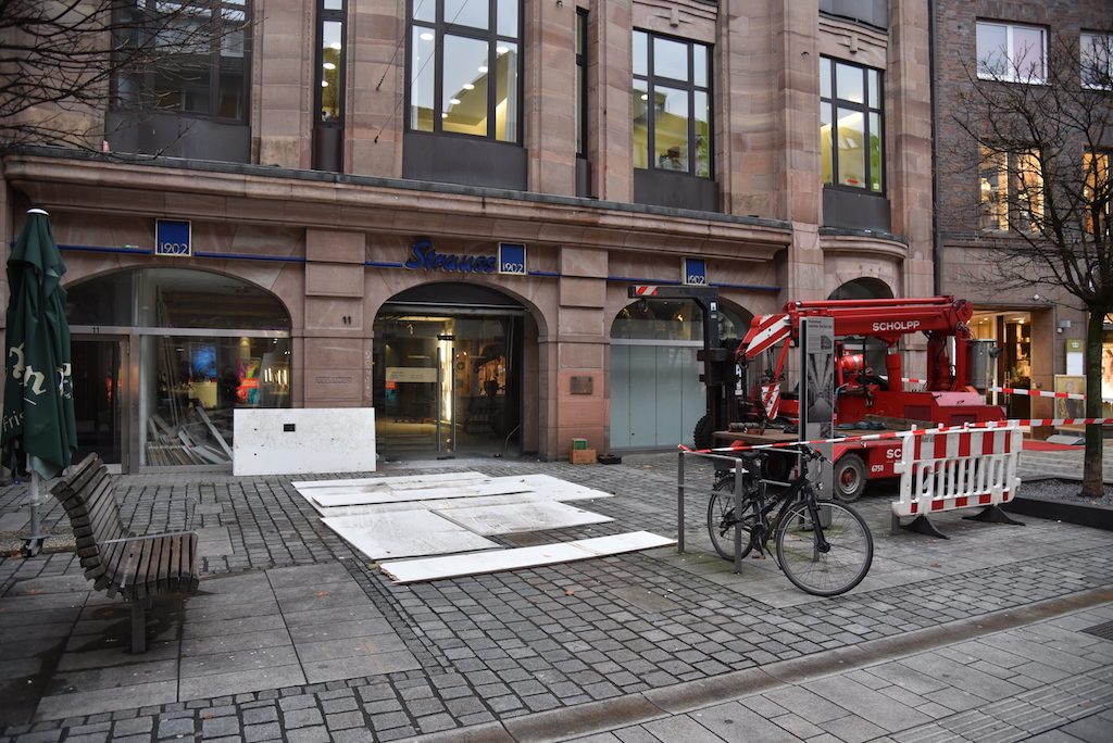 Zur Zeit wird die ehe­ma­lige Strauß-Filiale ent­kernt. Das Laden­lo­kal soll geteilt wer­den. Der obere Bereich mit dem Ein­gang aus der Wall­straße soll abge­trennt werden.