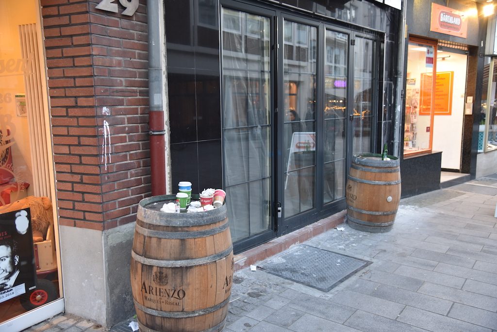 Das Restaurant Amore Lounge, Bergerstraße in der Altstadt ist seit einem Brand im Januar geschlossen. Im Gebäudeinneren werden zwar teilweise Renovierungsarbeiten durchgeführt, aber die Inhaber kümmern sich nicht um die Örtlichkeiten. So ist der Putz von der Renovierung kurz vor dem Brand noch auf dem Pflaster vorhanden und die beiden Weinfässer stehen Tag und Nacht draussen. Dadurch kann die Avista nicht mal richtig dort mit dem Besenwaren vorbei fahren. Außerdem werden die Tonnen als Müllablage genutzt. Wenn die Nachbargeschäfte nicht hin und wieder hier aufräumen würden, läge wohl noch mehr Müll dort.