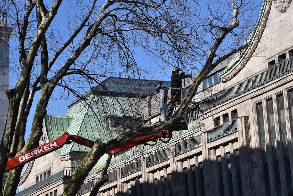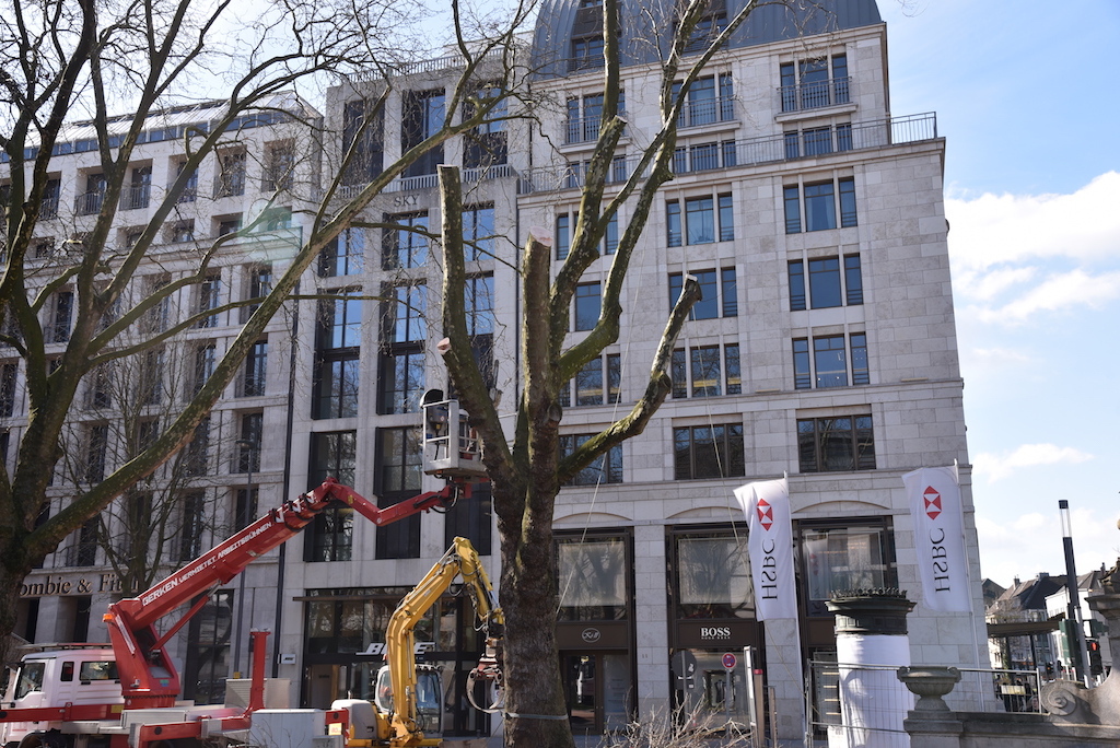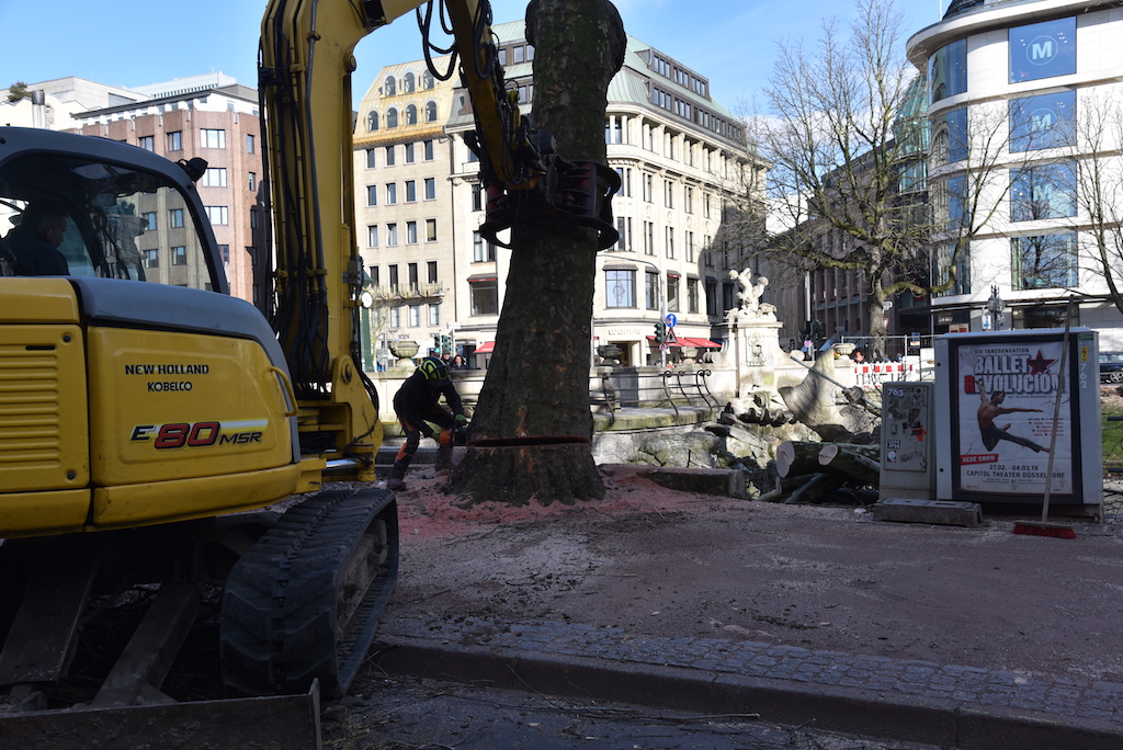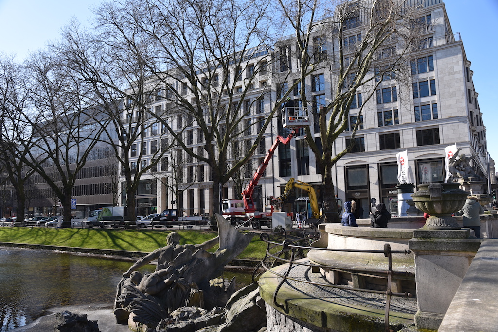 Heute wurden die beiden Platanen auf der KÖ gefällt. Die beiden alten Bäume mussten weichen, damit der denkmalgeschützte Tritonenbrunnen des Düsseldorfer Bildhauers Friedrich Coubillier erhalten bleiben kann. Dieses haben drei Gutachter im Vorfeld geprüft, Ersatzpflanzungen sollen vorgenommen werden. Zunächst werden fünf Parkbäume im Hofgarten gepflanzt.