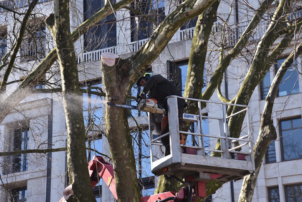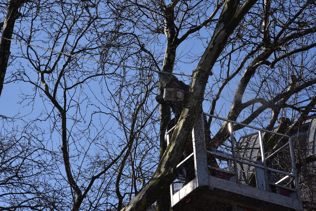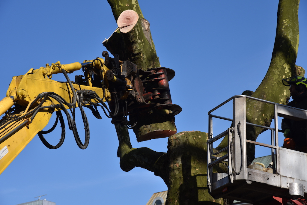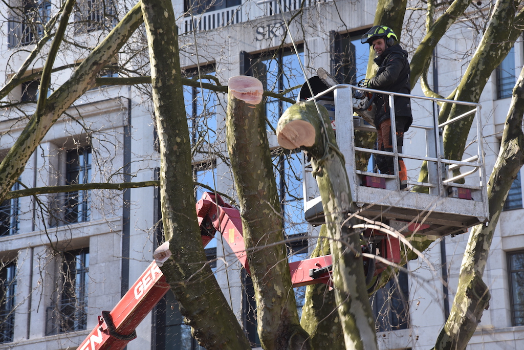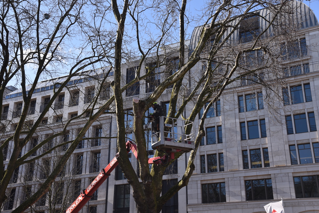 Heute wurden die beiden Platanen auf der KÖ gefällt. Die beiden alten Bäume mussten weichen, damit der denkmalgeschützte Tritonenbrunnen des Düsseldorfer Bildhauers Friedrich Coubillier erhalten bleiben kann. Dieses haben drei Gutachter im Vorfeld geprüft, Ersatzpflanzungen sollen vorgenommen werden. Zunächst werden fünf Parkbäume im Hofgarten gepflanzt.