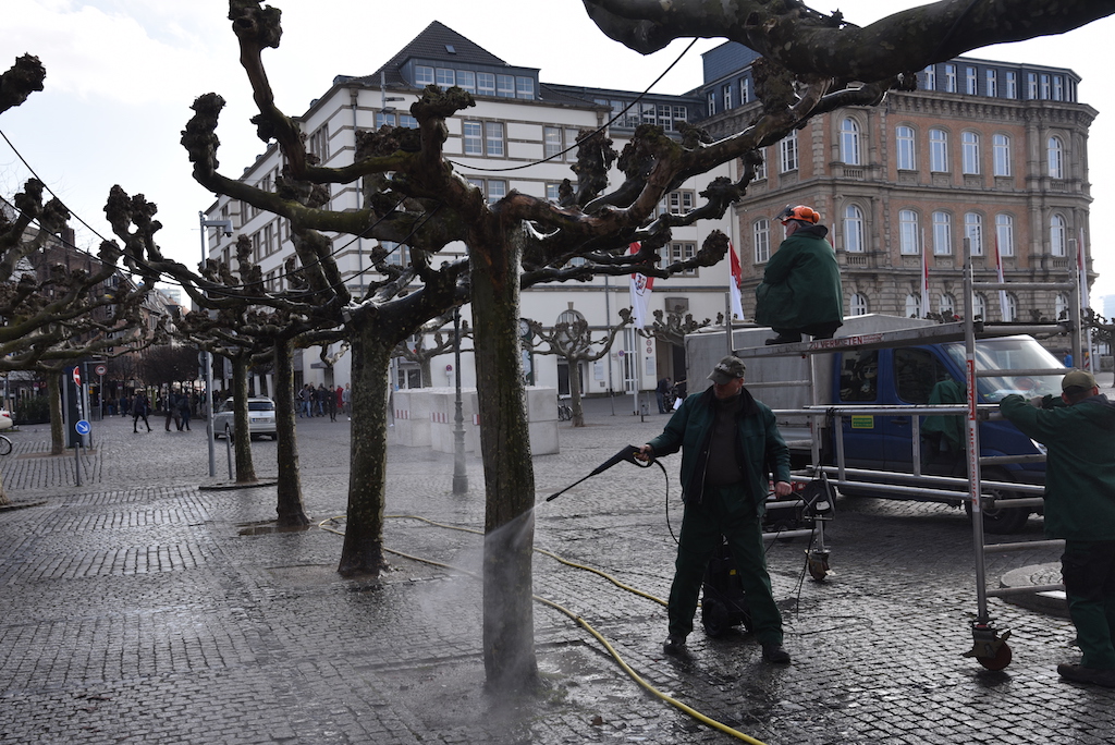 Die Platanen am Burgplatz bekommen mit einem Hochdruckreiniger eine Wäsche. Nicht weil sie dreckig sind, sondern weil jetzt um diese Zeit die Läuse hinter der Baumrinde ihre Nester bauen und die Eier legen. Darum werden die Platanen am Burgplatz einmal im Jahr um diese Zeit mit dem Hochdruckreiniger bearbeitet. Die lose Rinde wird abgewaschen und die Nester werden zerstört. Durch dieses Verfahren braucht keine Chemie eingesetzt zu werden.