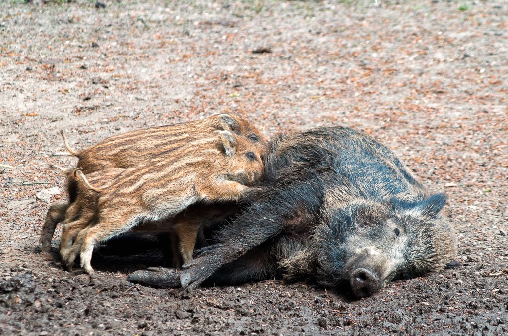 Bei den Wild­schwei­nen im Wild­park hat sich der erste Nach­wuchs des Jah­res ein­ge­stellt: Zahl­rei­che kleine Frisch­linge tum­meln sich im Gehege. Gut behü­tet unter den Augen ihrer Mut­ter­tiere, der Bachen, erkun­den die Frisch­linge mun­ter ihre nähere Umge­bung. Im Wild­schwein­ge­hege kön­nen Besu­cher sie dabei schon gut beobachten.