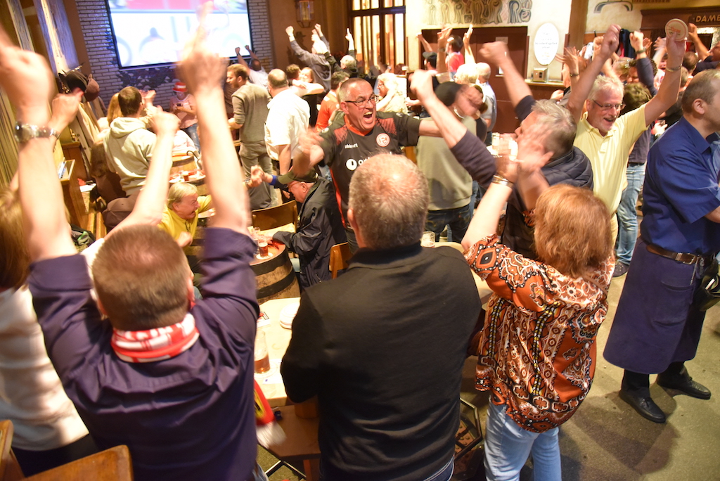 Jubelschrei in der 91 Minute bei den Fortuna Fans im Uerige. Fortuna geht nach einem spannenden Spiel in der Nachspielzeit in Führung. Nachdem Nürnberg bereits in der 13 Minute 2 : 0 führte glaubte keiner mehr an einen Gewinn der Meisterschaft. Doch Fortuna steckte nicht auf. Mit dem Anschlusstreffer ging es in die Halbzeit. Dann das 2:2 alles war wieder möglich und dann in der ersten Minute der Nachspielzeit dann das 3:2 für Fortuna zum Endstand. Die Fans lagen sich im Uerige in den Armen. Fortuna steigt nicht nur auf, sondern holt sich auch die Meisterschaft der zweiten Liga.