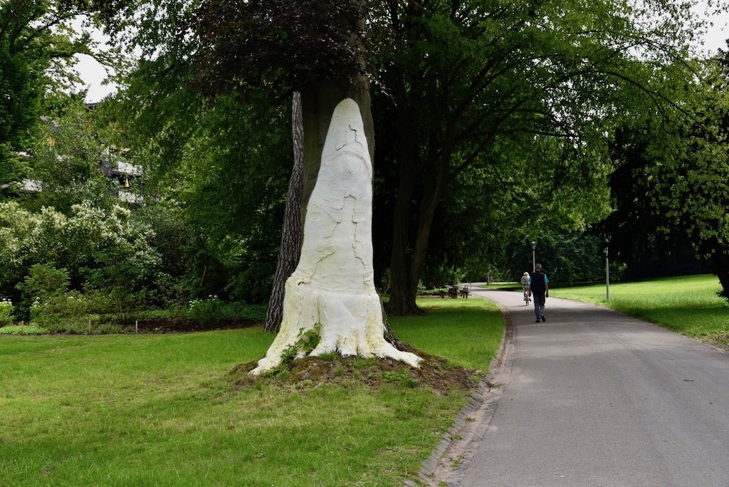 Der weiße Gnom auf dieser 180 Jahre alten Blutbuche ist kein Kunstwerk sondern simpler Schutzanstrich. Eine Art Sonnencreme.