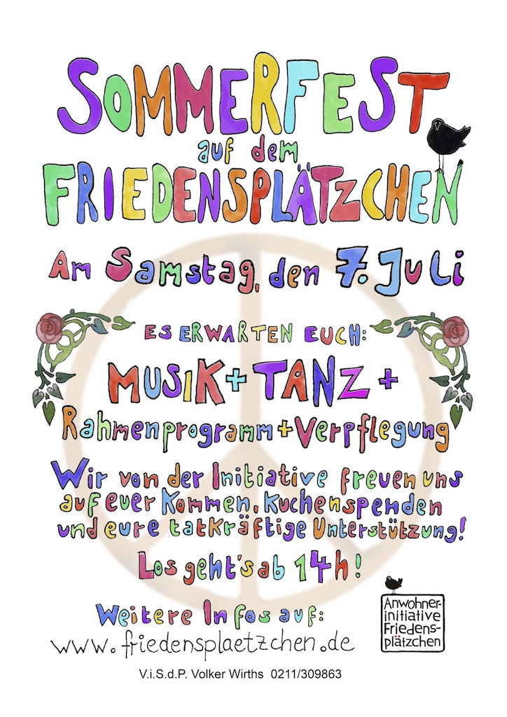 Am Samstag, den 7. Juli lädt die Anwohnerinitiative Friedensplätzchen in Unterbilk zum 22. Sommerfest seit ihrer Gründung im Jahr 1997 ein.