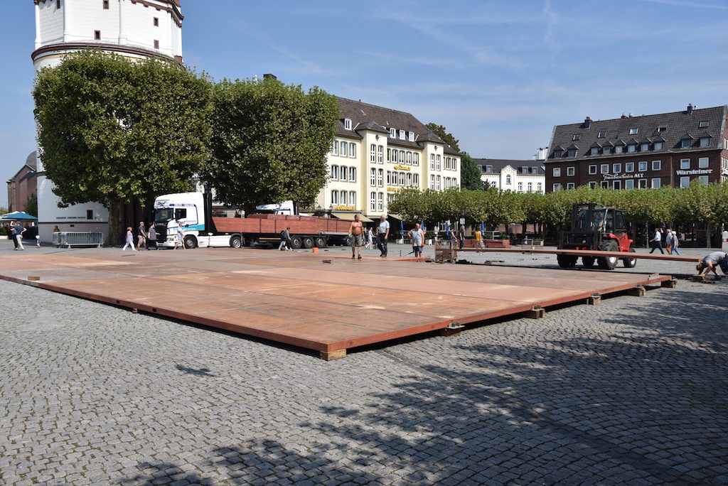 Heute hat der Aufbau für das am Samstag stattfindende Blindenfußballturnier auf dem Burgplatz begonnen. Auf dem Grundgerüst wird noch Kunstrasen verlegt und das Spielfeld wird mit meterhohen Banden eingezäumt.