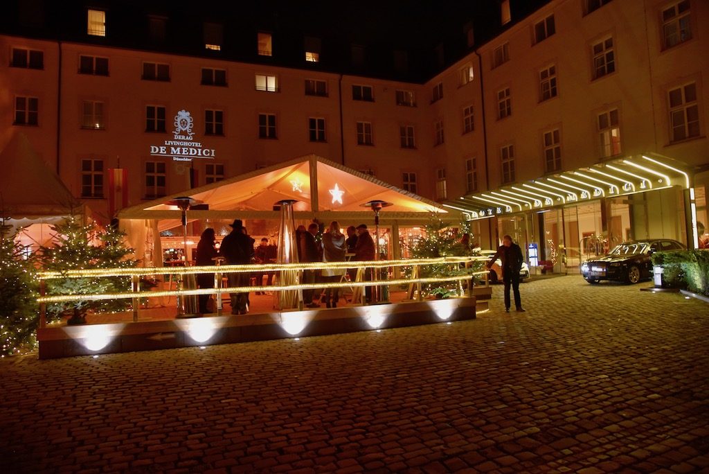 Wollen Sie mit Freunden und Bekannten ein paar besinnliche Stunden verbringen, schauen Sie doch mal in den Innenhof vom Hotel De Medici. Dort hat die Eventagentur Platzek wie im letzten Jahr eine Weihnachtshütte aufgebaut. Winterzauber pur. Es gibt dort leckeren Glühwein, gute Weine aber auch ein Uerige zu trinken. Täglich werden kleine wechselnde Gerichte zum Verzehr angeboten.
