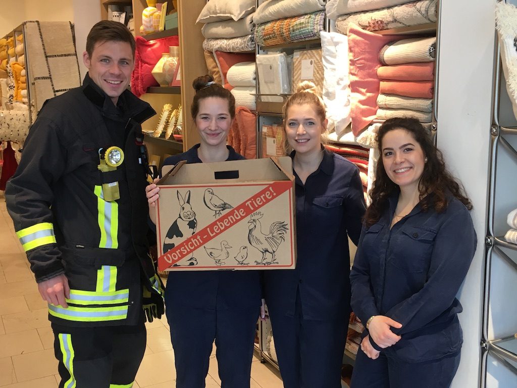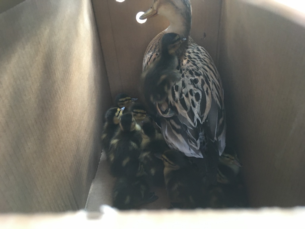 Königsallee, Stadtmitte Am Freitagvormittag wurde die Feuerwehr Düsseldorf gegen 11 Uhr von Mitarbeiterinnen eines Bekleidungsgeschäftes informiert, dass sich eine 12-köpfige Entenfamilie in einer misslichen Lage auf dem Flachdach eines Geschäftshauses auf der Königsallee befand. Durch den Leitstellendisponent wurde ein Hilfeleistungslöschfahrzeug der Feuerwache Hüttenstraße entsendet. Die eingetroffenen Einsatzkräfte stiegen über Leitern und Schächte auf das Flachdach und fanden eine besorgte Entenmutter mit ihren elf Küken vor. Behutsam wurde jedes Entenküken von den Kräften in eine spezielle Tieraufbewahrungsbox gesichert. Augenscheinlich war keines der Entenküken verletzt und freuten sich bester Gesundheit. Eine ehrenamtliche Entenliebhaberin wurde von der Leitstelle zur Einsatzstelle entsendet und nahm die Box mit der überglücklichen Entenmama und ihren Küken entgegen. Die komplette Entenfamilie wurde durch die ehrenamtliche Unterstützerin an einen sonnigen Platz am Hofgarten ausgesetzt. Nach rund 45 Minuten war der Einsatz für die fünf Feuerwehrleute beendet.