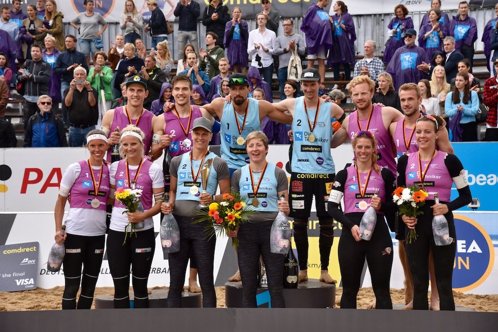 Zwei gute Ein­zel­spie­ler sind im Beach-Vol­ley­ball kein Garant für ein gutes Team, aber Jona­than Erd­mann und Jonas Schrö­der, die aus ver­let­zungs- bzw. krank­heits­be­ding­ten Grün­den auf ihre etat­mä­ßi­gen Part­ner ver­zich­ten muss­ten, schaff­ten es schnell zusam­men zu fin­den. In Finale tra­fen sie auf die Müns­ter­sie­ger Ben­net und David Ponie­waz (FC Schüt­torf 09) und spiel­ten ihre gute Tur­nier­leis­tung zunächst kon­stant wei­ter. Doch mit dem ein­set­zen­den Regen im zwei­ten Satz ver­lo­ren sie den sport­li­chen Faden, wäh­rend sich die Ponie­waz-Zwil­linge von dem Wet­ter­um­schwung nicht beir­ren lie­ßen und zum Satz­aus­gleich kamen. Im drit­ten Durch­gang kehr­ten Erdmann/Schröder wie­der auf die Erfolgs­spur zurück und konn­ten sich über den Titel­ge­winn bei der Tech­ni­ker Beach Tour Düs­sel­dorf freuen. „Wahn­sinn, vie­len Dank an das tolle Publi­kum, das bei die­sem Regen­schauer geblie­ben ist und uns wei­ter ange­feu­ert hat. Es war ein gro­ßes Fest!“, sagte Jona­than Erd­mann. „Wir haben mit dem ein­set­zen­den Regen Pro­bleme mit der Umstel­lung gehabt. Der Ball wurde schwer und glit­schig. Außer­dem war der Wind sehr böig. Das haben die Ponie­waz Zwil­linge bes­ser gemacht. Im drit­ten Satz haben wir uns noch mal voll kon­zen­triert, um die­ses tolle Tur­nier in Düs­sel­dorf gut abzu­schlie­ßen. Das ist uns dann ja auch gelun­gen”, sagte Jonas Schrö­der. Einen über­ra­schen­den drit­ten Platz erreichte das zweite Inte­rims­duo Valen­tin Bege­man­n/­Max-Jonas Karpa (ETV Ham­burg). Nach engem ers­tem Satz gewan­nen sie sou­ve­rän gegen Armin Dollinger/Simon Kul­zer (SV Lohhof).