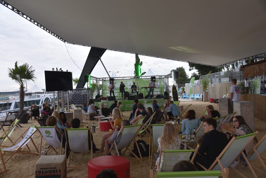 Obwohl nicht das optimale Wetter war, der Beach Club am alltours Kino war gut besucht zur After Work Party. Insgesamt stehen sieben After Work-Termine auf dem Programm – immer donnerstags jeweils ab 17 Uhr. Für die musikalischen Highlights sorgte Daniel Hall, Gründer und Bandleader von Fresh Music Live mit seiner Agentur „the HEG“, die Nachwuchskünstler zu Profis macht. Heute spielte die Gruppe Glow Co.