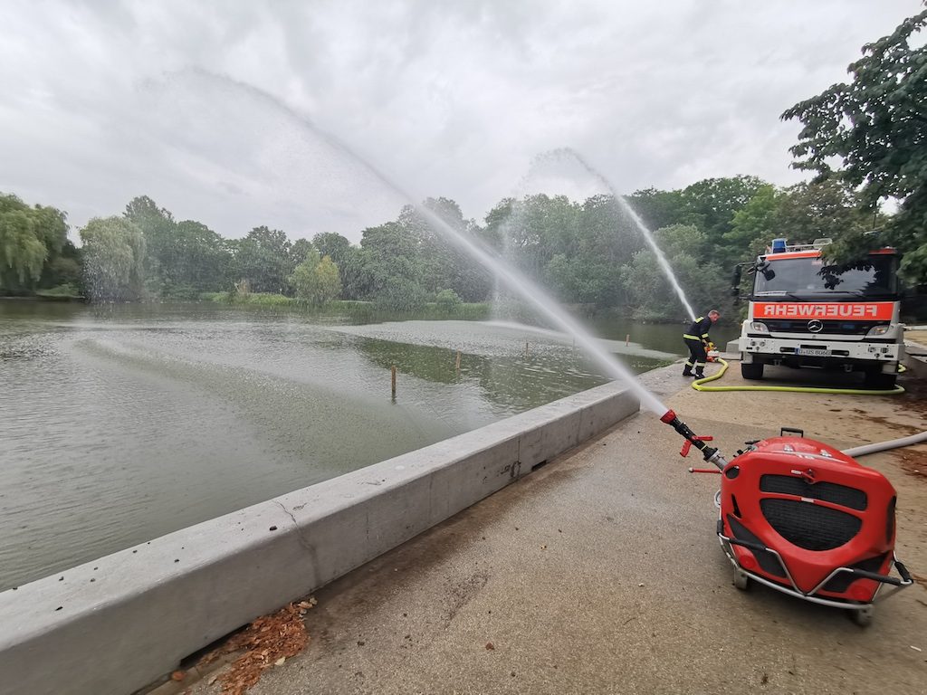 Aufgrund der lang andauernden Trockenheit sind die Pegelstände der Weiher im Zoopark und im Ostpark deutlich gesunken. Um den Pegel zu steigern und so unter anderem wieder für eine Erhöhung des Sauerstoffgehaltes zu sorgen, wurde dem Weiher im Zoopark heute, Dienstag, 13. August, Frischwasser zugeführt. Ebenfalls am heutigen Abend wurde der Weiher im Ostpark umgewälzt, um auch dort den Sauerstoffgehalt zu erhöhen. Eine Pegelerhöhung durch Frischwasserzufuhr ist am Ostparkweiher nicht möglich, da der Weiher mit dem Grundwasser verbunden ist und das zugeführte Wasser ins Erdreich versickern würde.