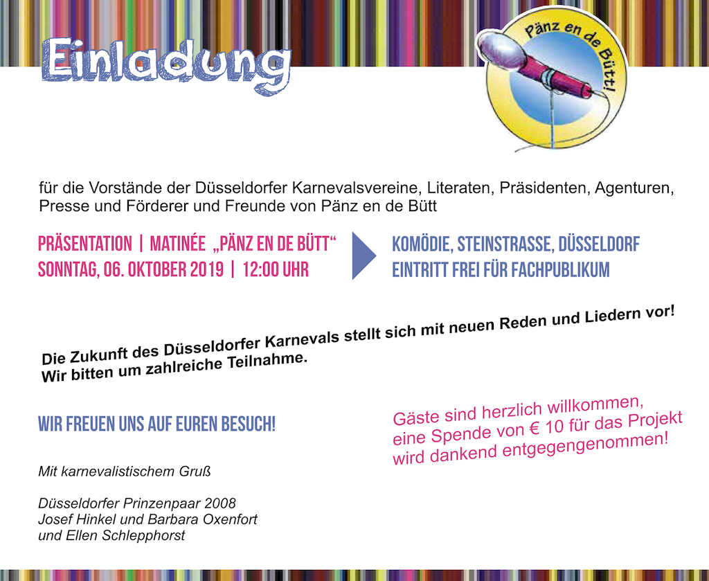Am kom­men­den Sonn­tag, den 6. Okto­ber 2019, 12 Uhr prä­sen­tie­ren die „PÄNZ EN DE BÜTT“ ihr neues Programm.