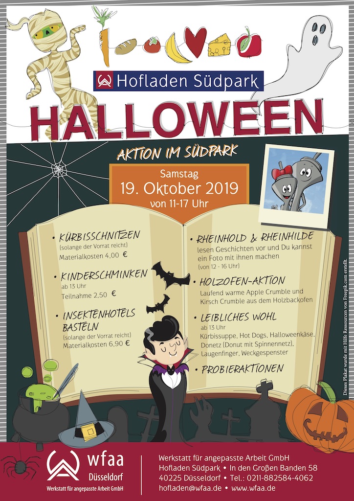 Am Samstag, dem 19.10.2019 werden im Südpark von 11 bis 17 Uhr wieder die Messer geschwungen. Im Rahmen der Halloween-Aktion rund um den Hofladen Südpark der Werkstatt für angepasste Arbeit GmbH (WfaA) werden harmlose Kürbisse zu Fratzen geschnitzt.