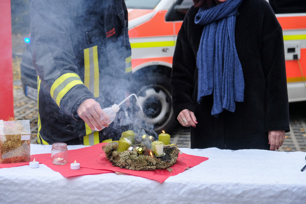 In der Weih­nachts­zeit kommt es immer wie­der zu Brän­den von Advents­ge­ste­cken oder Weih­nachts­bäu­men. Feu­er­wehr­de­zer­nen­tin Helga Stul­gies und Feu­er­wehr­spre­cher Chris­to­pher Schus­ter zeig­ten, wie Brände ent­ste­hen und wie sie gelöscht wer­den können,©Landeshauptstadt Düsseldorf/Gstettenbauer
