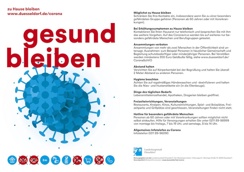 Darauf finden sich die in dieser Zeit wichtigen Verhaltenshinweise wie “Möglichst zu Hause bleiben”, “Ansammlungen vermeiden”, “Abstand halten” Tipps, was zu tun ist, wenn jemand Erkältungssymptome zeigt, Hinweise zur Öffnung von Geschäften und Gastronomie sowie zu Veranstaltungen und wichtige Telefonnummern, wie die der Corona-Hotline 0211–8996090 und die Rufnummer, unter der besonders gefährdete Menschen Hilfe, zum Beispiel beim Einkaufen, erhalten: 0211 89–98999.