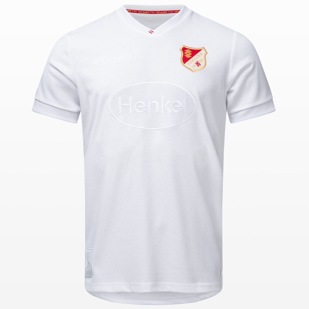 Die Vorderseite vermittelt eine Baumwollhaptik, welche an alte Fußballtrikots angelehnt ist. Das „Henkel“-Logo auf der Brust ist Ton-in-Ton eingestickt. Weiterhin ziert die Front eine modernisierte Version eines der ersten Fortuna-Logos: Ein Turnerkreuz mit den vier „F“ für „frisch, fromm, fröhlich, frei“ sowie dem Bergischen Löwen als Wappentier von Düsseldorf. Abgerundet wird das Signet durch einen „Fortuna 1895“-Schriftzug. Am unteren rechten Rand des Trikots befindet sich ein Web-Badge mit den Jahreszahlen „1895“ und „2020“ sowie dem F95-Logo. Auf der Rückseite ist im Bereich des Nackens ein „F95“-Stick eingestickt, der ebenfalls in Weiß gehalten ist. Weiterhin ziert die Rückseite ein stilisiertes Turnerkreuz, das aus kleinen Luftlöchern im Mesh-Gewebe besteht. Die Rückennummern zu diesem Trikot werden wie der Schriftzug „Düsseldorf“ und der Spielername in Rot umgesetzt und besitzen zudem eine goldene Umrandung. Ausgeliefert wird das Trikot in einer edlen Kartonage mit Schubfach, in dessen Innenseite noch einmal die bedeutendsten Höhepunkte aus 125 Jahren Vereinsgeschichte nachzulesen sind.