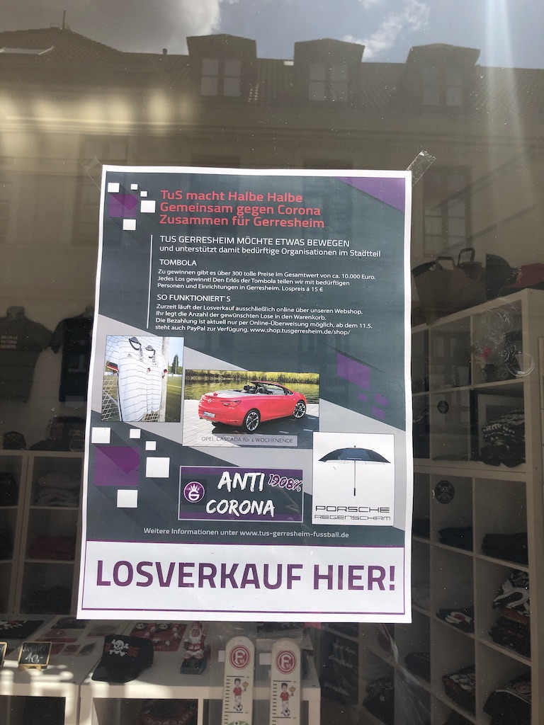Um die inzwischen bedrohlichen Verluste durch das miese kleine Virus abzufedern, hat der örtliche Sportverein TUS Gerresheim die Anti-Corona-Tombola „TUS macht Halbe Halbe“ ins Leben gerufen.